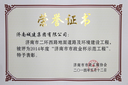 济南市西客站片区市政蹊径(二期)第二标段蹊径BT施工项目被评为2014年度济南市市政金杯树模工程