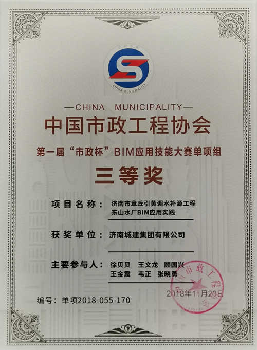 集团《济南市章丘引黄调水补源工程东山水厂BIM应用实践》荣获“第一届市政杯BIM应用手艺大赛单项组三等奖”