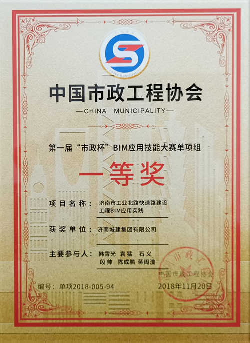 集团《济南市工业北路快速路建设工程BIM应用实践》荣获“第一届市政杯BIM应用手艺大赛单项组一等奖”