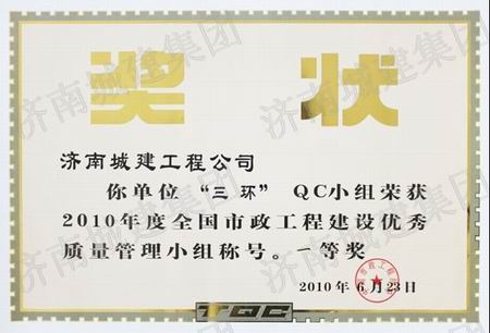 “三环”QC小组荣获2010年度天下市政工程建设优异质量治理小组一等奖