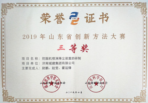 集团《挖掘机喷淋降尘装置的研制》荣获“2019年度山东省立异要领大赛三等奖”