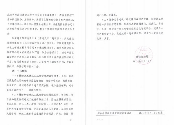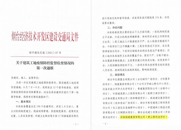 8月10日,烟台开发区建设交通局对一分公司烟台黄山路项目部的防疫事情予以转达表扬,充分一定了项目部在此次防疫事情中的优异体现 。