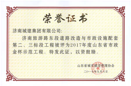 济南旅游路东段蹊径刷新与市政设施配套第二、三标段工程被评为2017年度年度山东省市政金杯树模工程