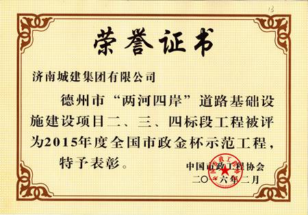 德州市“两河四岸“蹊径基础设施建设项目二、三、四标段工程被评为天下市政金杯树模工程