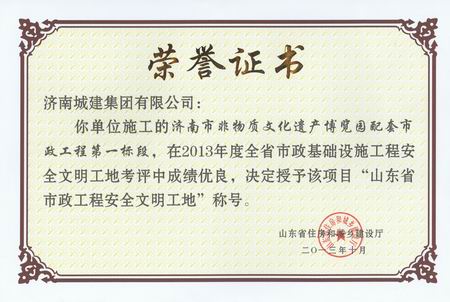 济南市非物质文化遗产博览园配套市政工程第一标段荣获2013年度山东省市政工程清静文明工地称呼