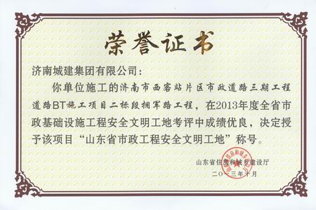 智慧园AA路工程荣获2013年度山东省市政工程清静文明工地称呼