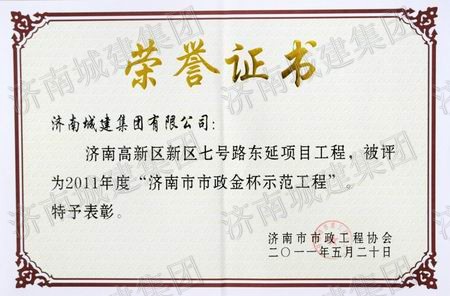 济南高新区新区七号路东延项目工程被评为2011年度济南市市政金杯树模工程