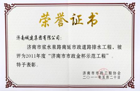 济南市浆水泉路南延市政蹊径排水工程被评为2011年度济南市市政金杯树模工程