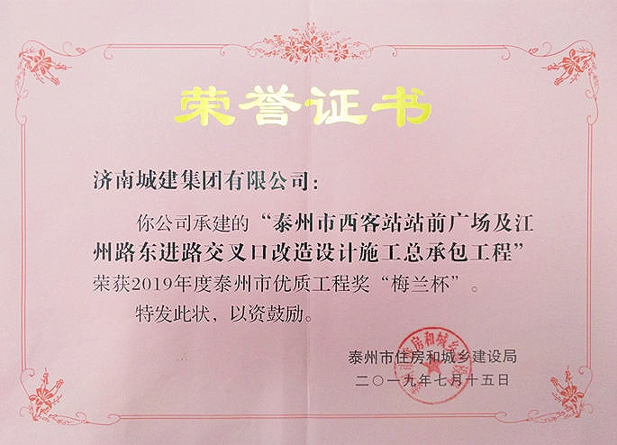 泰州市西客站站前广场及江州东进路交织口刷新设计施工总承包工程被评为2019年度泰州市优质工程奖”梅兰杯“