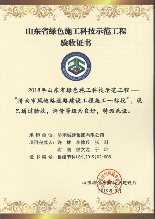 济南市凤歧路蹊径建设工程施工一标段被评为2018年山东省绿色施工科技树模工程