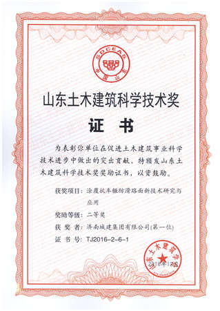 涂覆抗车辙防滑路面新手艺研究与应用获山东土木修建科学手艺奖二等奖