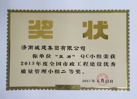 “蓝盾”QC小组荣获2013年度天下市政工程建设优异质量治理小组二等奖