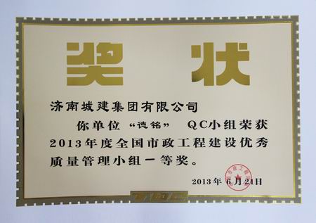 “德铭”QC小组荣获2013年度天下市政工程建设优异质量治理小组一等奖