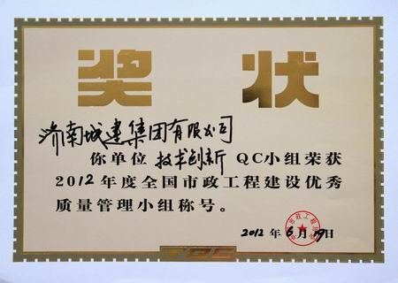 “手艺立异”QC小组荣获2012年度天下市政工程建设优异质量治理小组称呼
