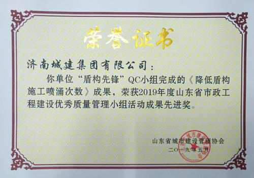 集团“盾构先锋”QC小组完成的《降低盾构施工喷涌次数》效果荣获“2019年度山东省市政工程建设优异质量治理小组运动效果先进奖