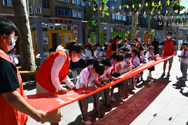 ×îºó£¬Ð¡ÅóÙÃÇÔÚ¡°ÒÔÍÅ´ø¶Ó н»ðÏà´« Çå¾²¡®Í¯¡¯ÐС±µÄÌõ·ùÉÏÇ©ÉÏ×Ô¼ºµÄÃû×Ö£¬ÐØ´øÉÙÏȶӻգ¬Ò»±ÊÒ»»µÄÈÏÕæÌÜд£¬ÏÊÑ޵ĺìÉ«Ìõ·ùÓ³ºìÁ˺¢×ÓÃǵÄÐ¡ÃæÅÓ£¬ÔÚº¢×ÓÐÄÖв¥ÖÖÏÂÓÅÃÀµÄÖÖ×Ó¡£